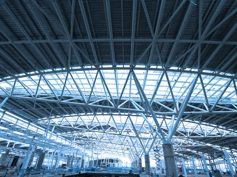 5. रूफिंग आणि एक्सटीरियर क्लेडिंग एकदा स्टील फ्रेम पूर्ण झाल्यावर, छप्पर प्रणाली स्थापित केली जाते, विशेषत: इन्सुलेटेड मेटल पॅनेल किंवा सिंगल-प्लाय मेम्ब्रेन सामग्री वापरून. बाह्य भिंती, जर डिझाइनमध्ये समाविष्ट केल्या असतील तर, मेटल पॅनेल, वीट किंवा इतर क्लेडिंग सामग्री वापरून देखील स्थापित केल्या जातात.