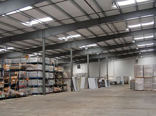 कोल्ड स्टोरेज: स्टीलच्या गोदामे कोल्ड स्टोरेजसाठी डिझाइन केल्या जाऊ शकतात, अन्न आणि फार्मास्युटिकल्स सारख्या नाशवंत वस्तूंसाठी कमी तापमान राखण्यासाठी.