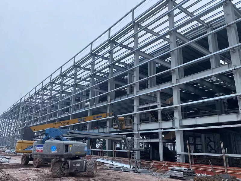 कार्यशाळेची स्टील फ्रेम सामान्यत: स्तंभ, बीम आणि ब्रेसेससह बनलेली असते, जी कठोर आणि स्थिर रचना तयार करण्यासाठी परस्पर जोडलेली असते. स्टीलच्या सदस्यांना बर्‍याचदा कारखान्यात प्रीफेब्रिकेट केले जाते आणि नंतर असेंब्लीसाठी साइटवर नेले जाते, ज्यामुळे बांधकाम वेळ लक्षणीय प्रमाणात कमी होतो.